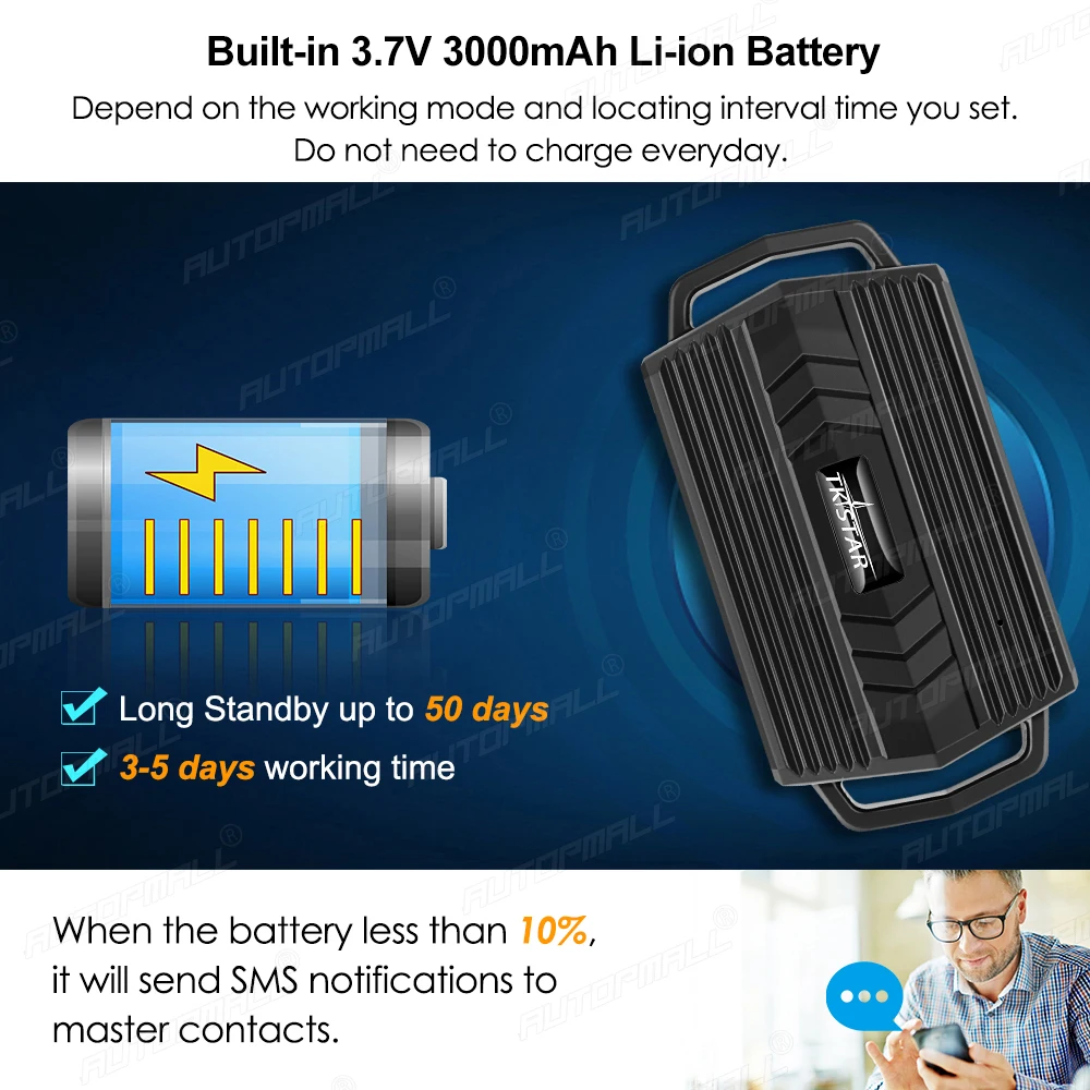 It has built-in 3.7V 3000mAh Li-ion battery, can standby up to 50 days.