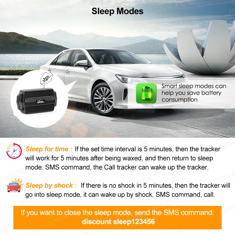 * Sleep by time mode: After did this setting, tracker will only work for 5 minutes after being waked up, and back to sleep mode, GPS will shut off and GSM will works in low consumption mode. SMS, call will can wake up the tracker.