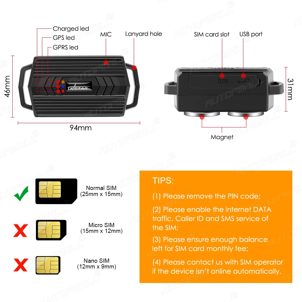 * Please use the normal SIM card for the tracker, not Micro SIM or Nano SIM.