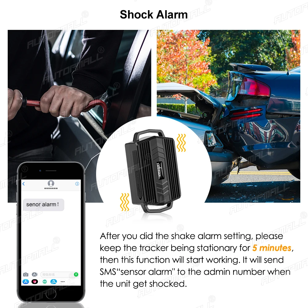 After you did the shake alarm setting,please keep the tracker being stationary for 5 minutes, then this function will start working. It will send SMS "sensor alarm!" to the admin number when the unit get shocked.